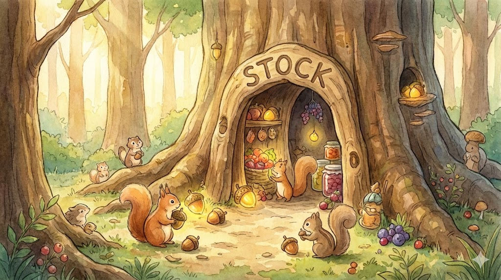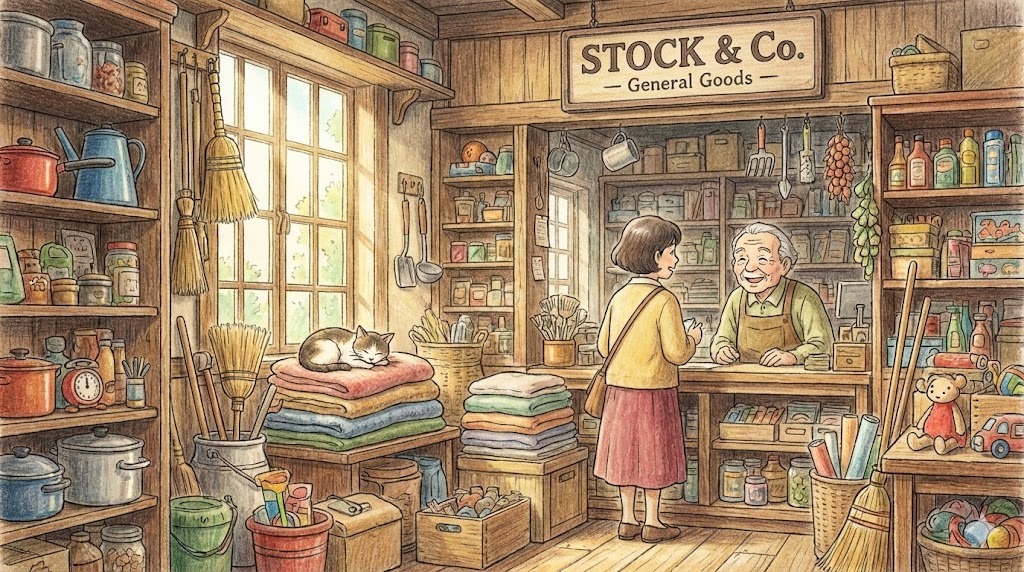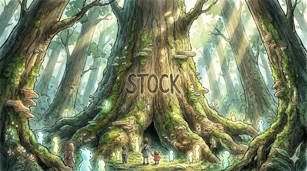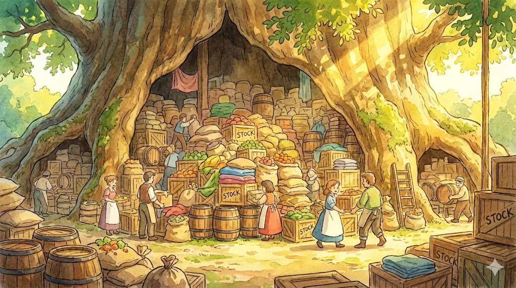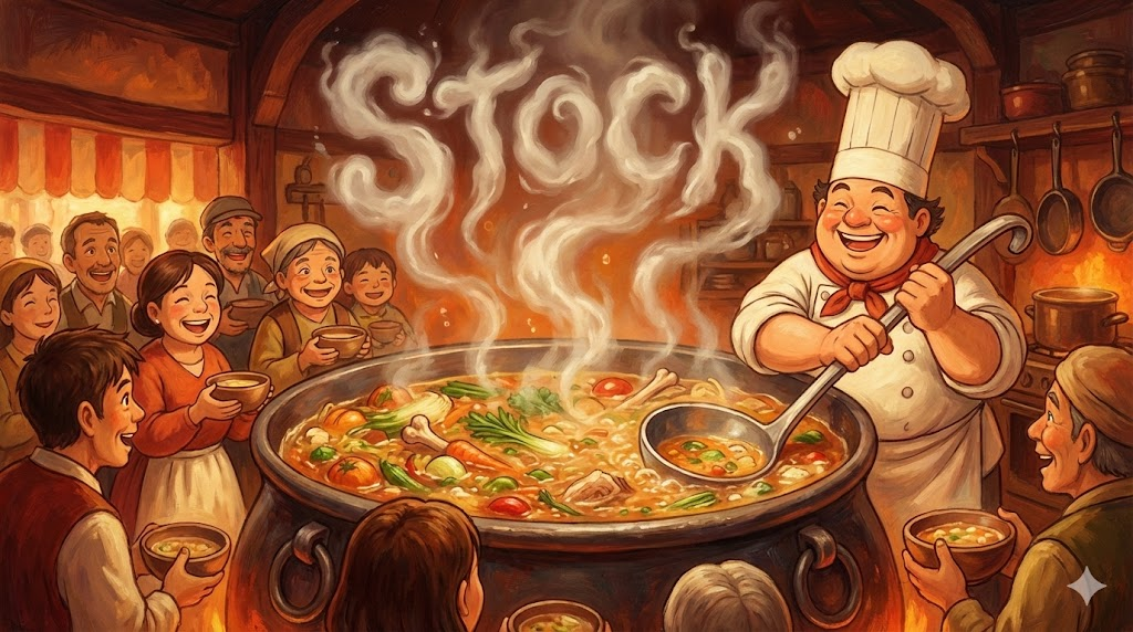 | 고대 영어 stocc (나무줄기, 통나무) | "가장 기본이 되는 줄기/덩어리" | 혈통/가문 -> (자라날) 자본금/주식 -> (쌓아둔) 재고/비축물 -> (요리) 육수 |