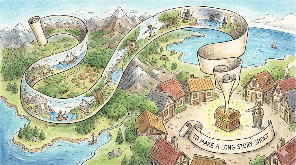 to make a long story short [tuː meɪk ə lɔːŋ ˈstɔːri ʃɔːrt]