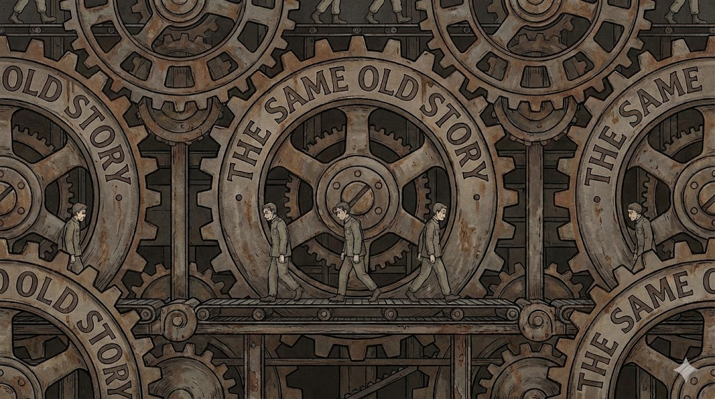 상황이 변하지 않고 예전과 똑같은 문제가 되풀이되거나, 누군가가 뻔한 변명이나 거짓말을 반복할 때 사용하는 표현입니다. 지루함, 체념, 혹은 비판적인 태도를 나타냅니다.