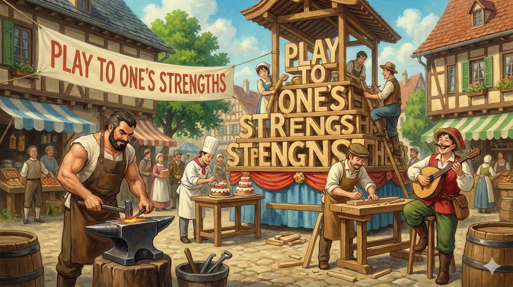 - 해석: 자신이 가장 잘하는 부분이나 장점을 최대한 활용하여 성과를 내는 전략. (경영, 자기 계발 지문에서 중요)