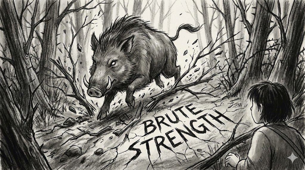 - 해석: 기술이나 지성 없이 오로지 물리적이고 거친 힘에만 의존하는 것.