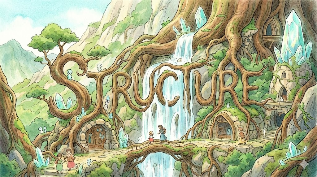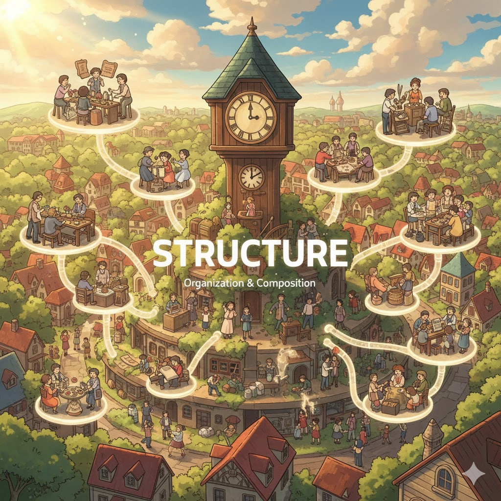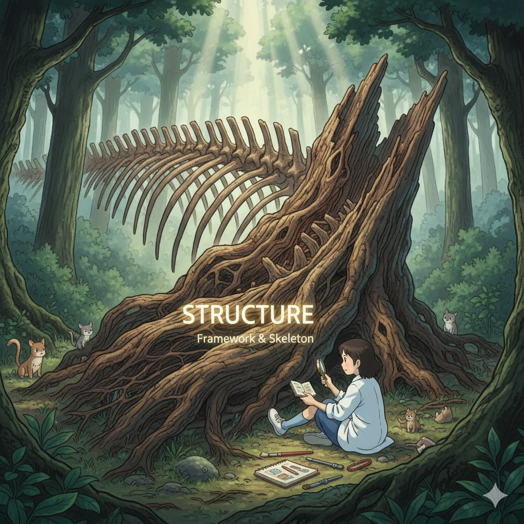 | 라틴어 structūra (짓기, 배열) | "부분을 조립하여 만든 전체" | 건축물/구조물 → (사회/조직의) 구조/체계 → (글/생각의) 구성 → 조직화하다 |