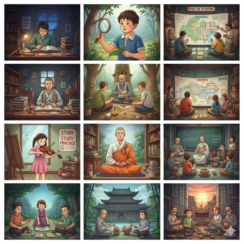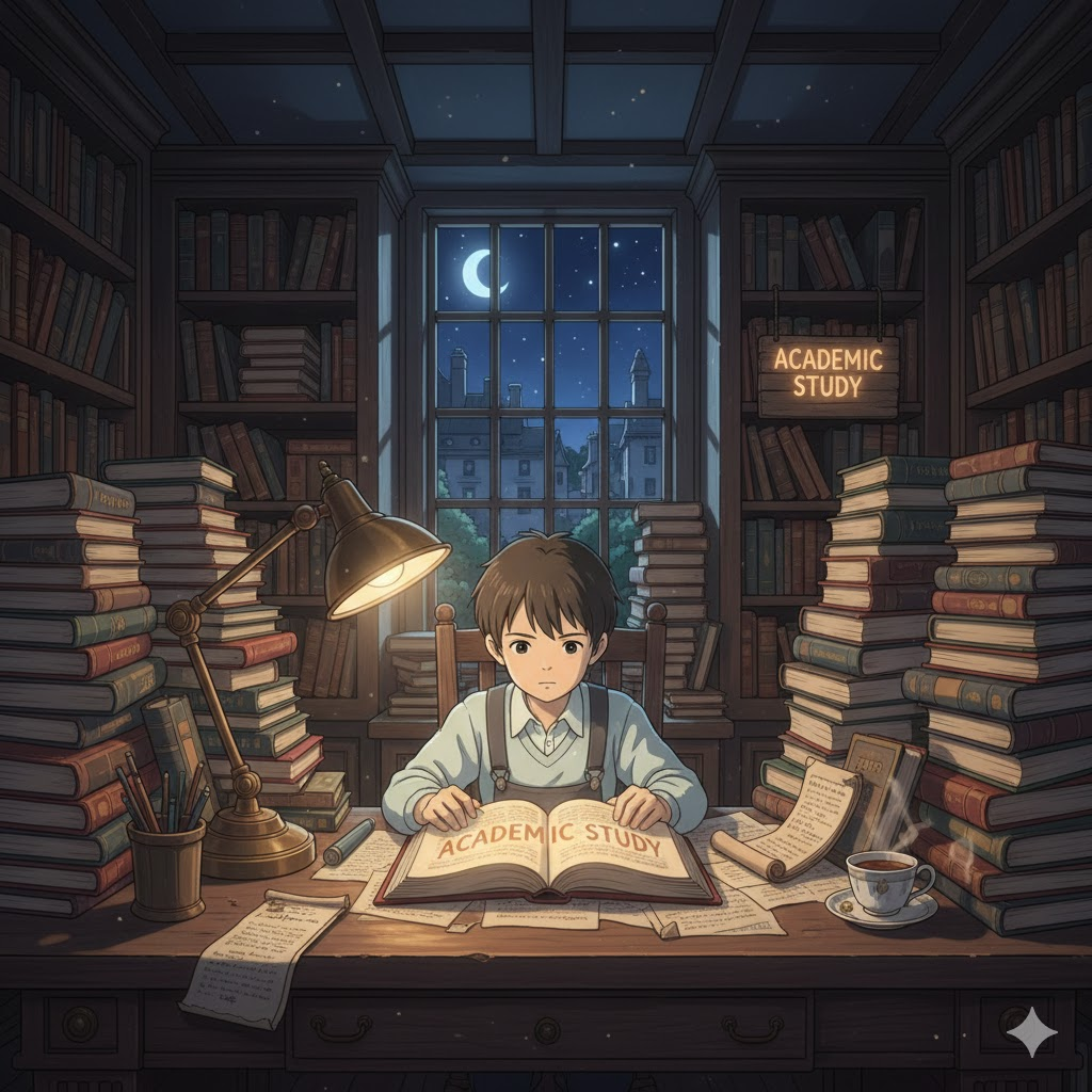 | 라틴어 studium (열의, 헌신, 연구) | "무언가에 헌신적으로 몰두함" | 공부/학습 (지식 습득) → 연구/조사 (깊은 탐구) → 서재 (몰두하는 방) → 습작 (미술) |