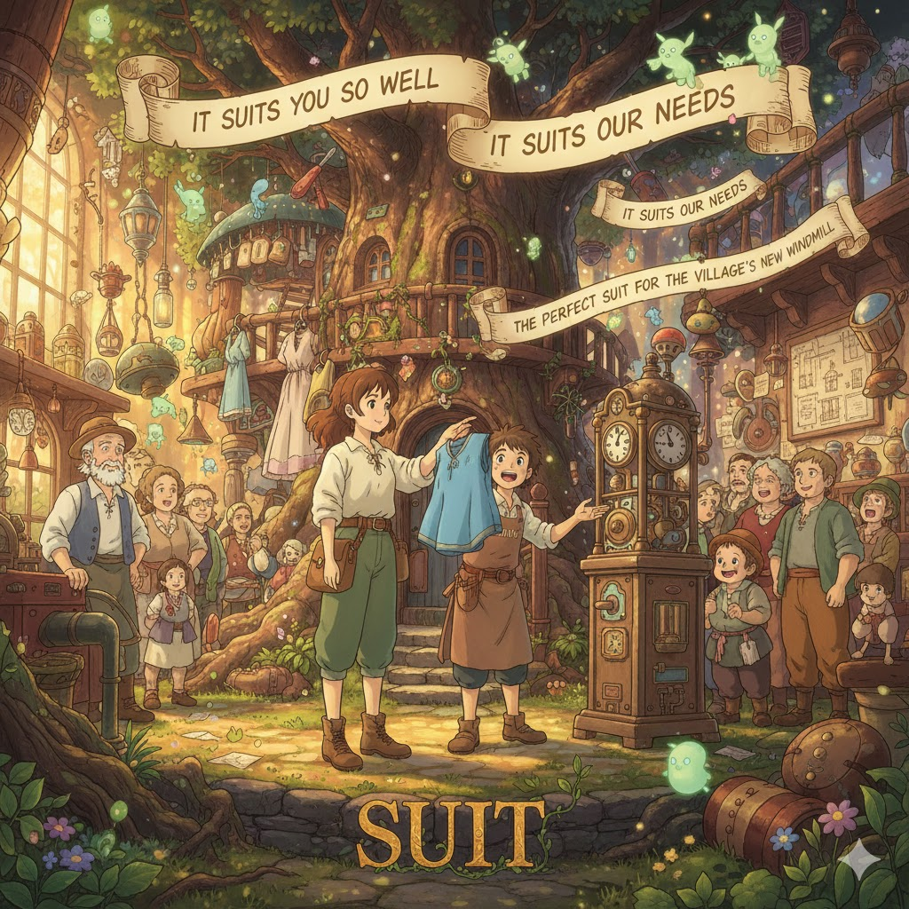| suit | 정장, 소송, 어울리다 | 명사/동사로, '맞춤'. | '몸' '에' '맞는' '옷,' '법' '에' '맞는' '절차,' '상황' '에' '어울림' '을' '의미하는' '기본' '개념'. |