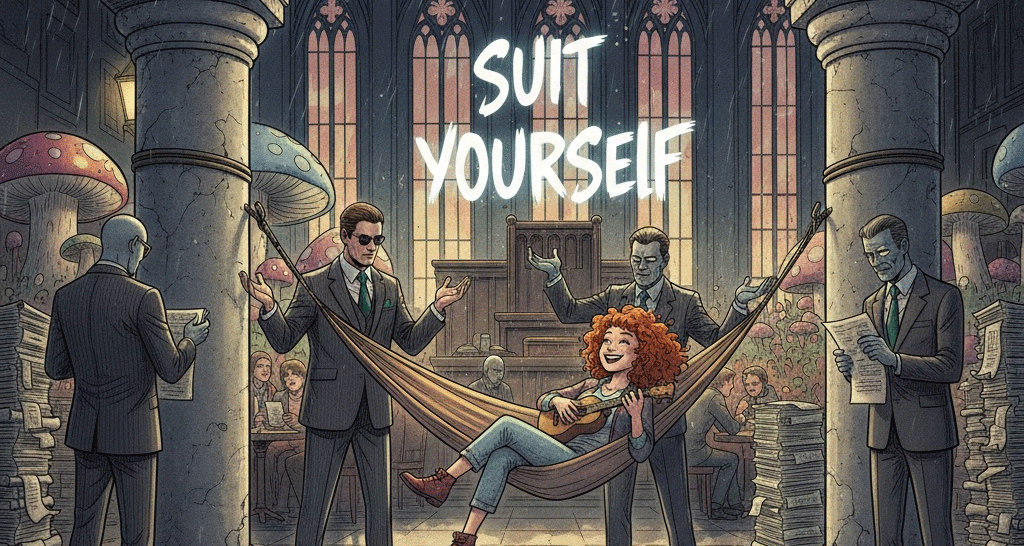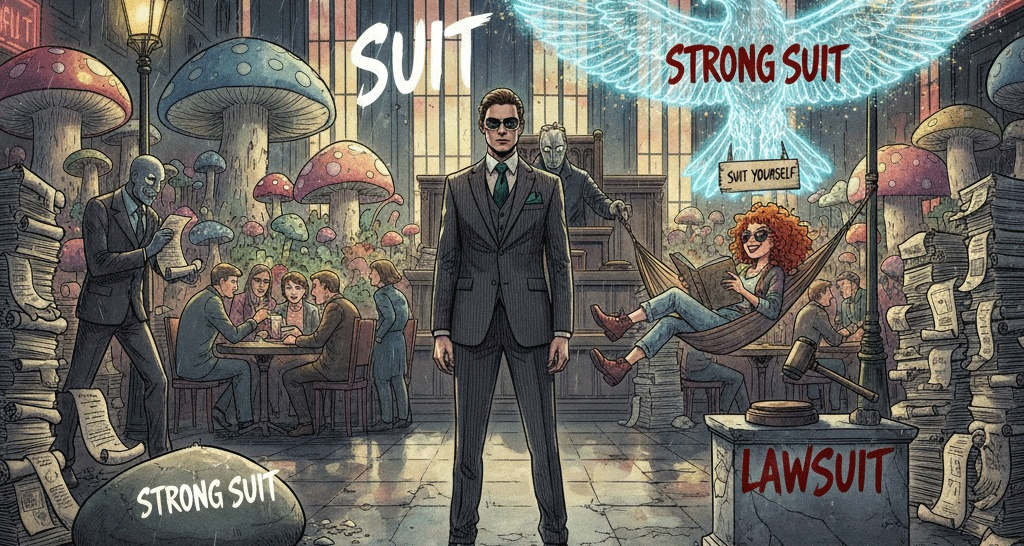 정장, 소송, 적합함. 의복, 법적 분쟁, 남을 따르는 행위, 그리고 개인의 강점.