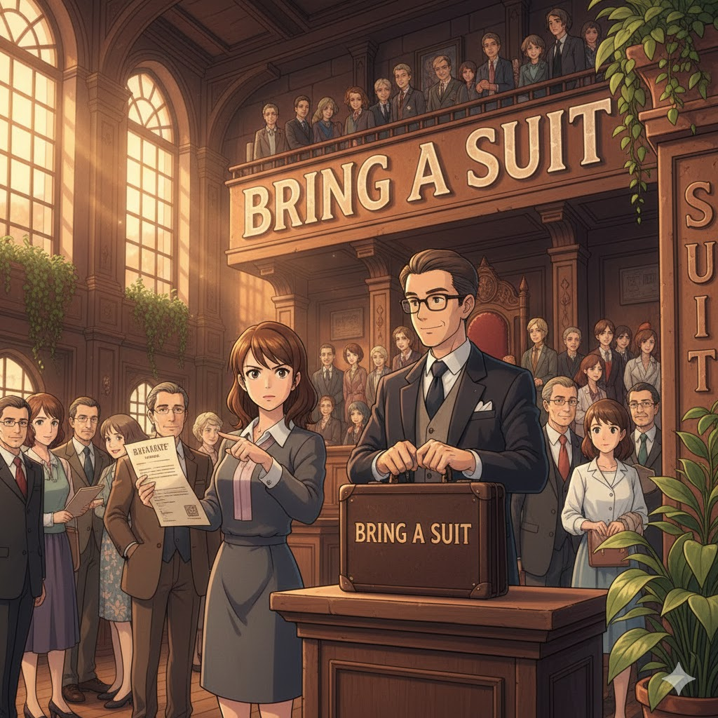 - 예문: He decided to bring a suit against the neighbor for property damage. (그는 재산 피해에 대해 이웃을 상대로 소송을 제기하기로 결정했다.)