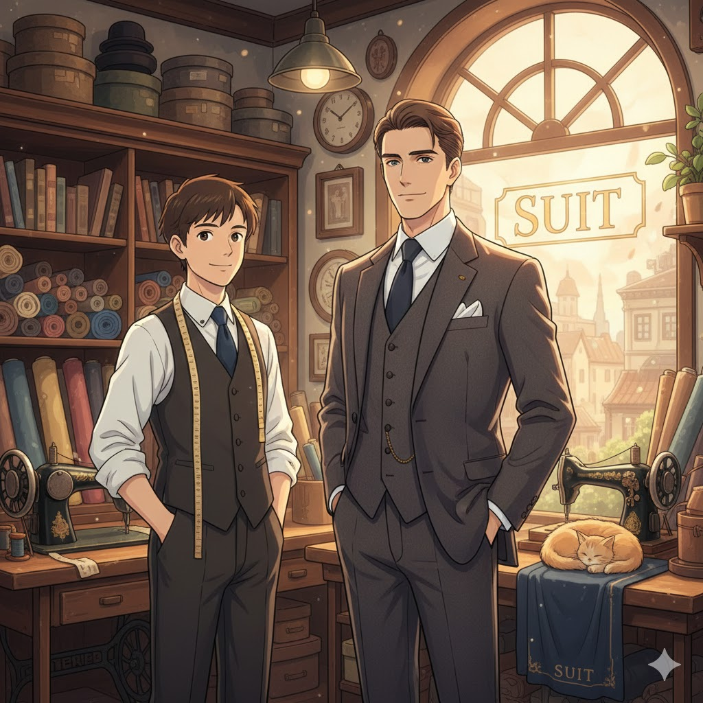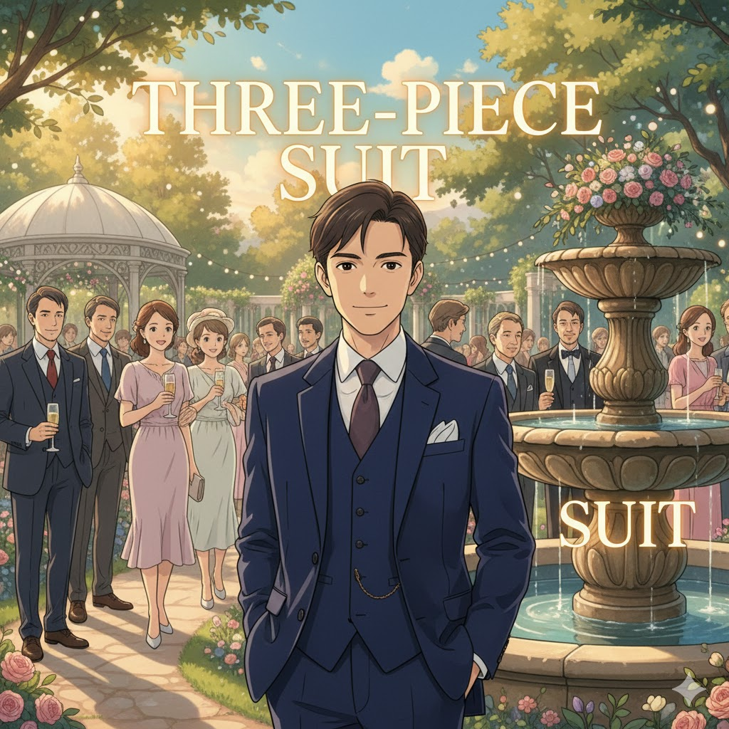 일반적인 투피스 정장(재킷+바지)에 조끼(vest/waistcoat)까지 포함하여 같은 원단으로 만든 세 조각 한 벌의 정장을 의미합니다. 더 격식 있고 갖춰 입은 느낌을 줍니다.