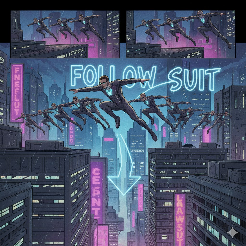 - 예문: When one major bank lowered its interest rates, the others quickly followed suit. (한 주요 은행이 금리를 내리자, 다른 은행들도 빠르게 선례를 따랐다.)