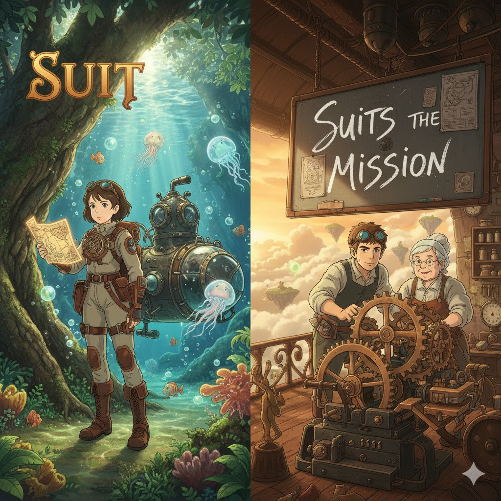 'space/bathing/hazmat suit' 등은 특수 의복을, 'suit of armor'는 갑옷을, 'bring a suit'는 소송 제기를 나타냅니다.