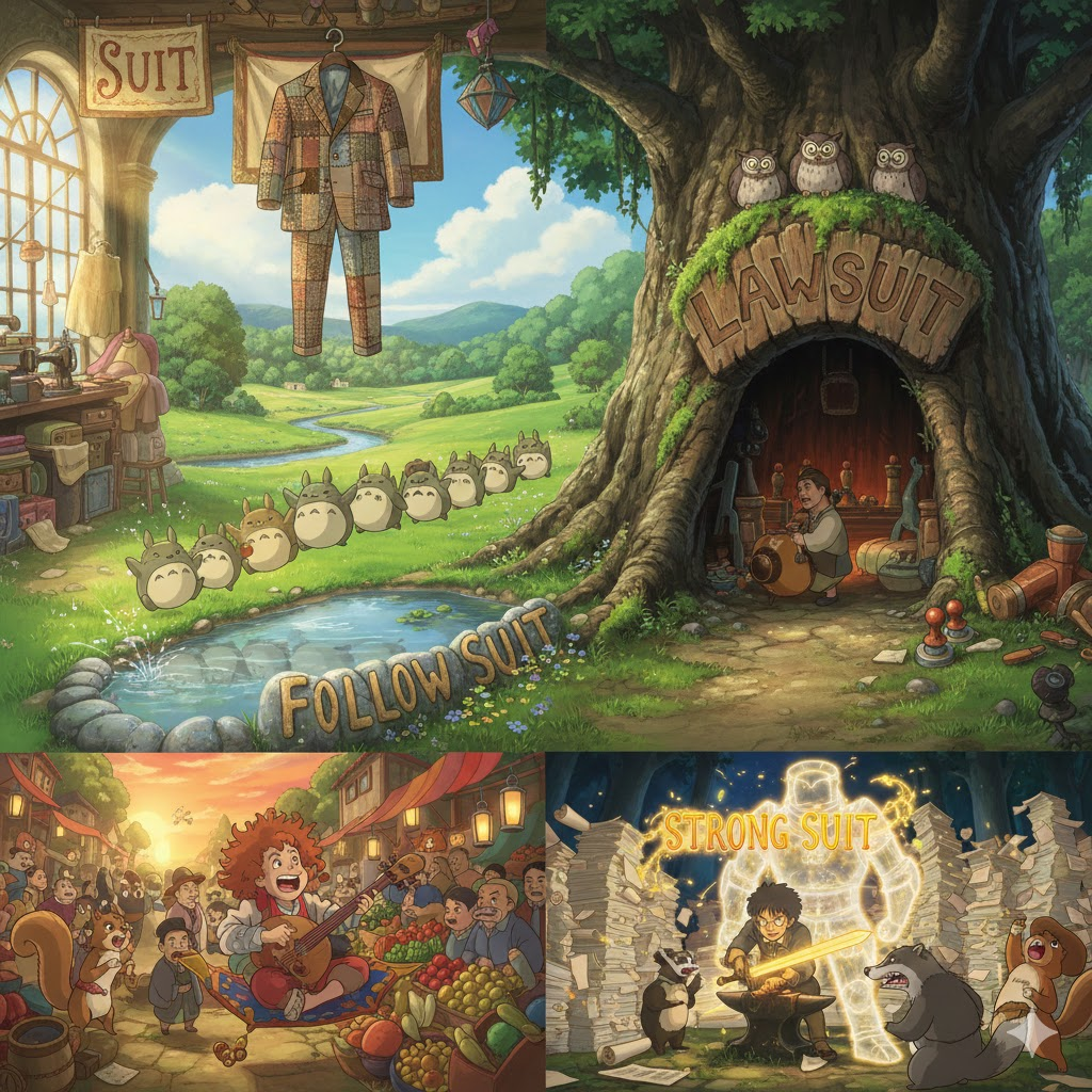 'suit'는 '한 벌의 옷(정장)'이나 '법적 소송'을 의미하는 가장 기본적인 단어입니다. 동사로는 '어울리다' 또는 '만족시키다'는 뜻입니다. 'follow suit'는 '카드 게임에서 남이 낸 패와 같은 짝을 내다'는 의미에서 유래하여, '남이 하는 대로 따라 하다'는 뜻으로 쓰입니다. 'suit yourself'는 '네 마음대로 해라'는 뜻으로, 상대방의 결정에 상관하지 않겠다는 뉘앙스를 가집니다. 'strong suit'는 '카드 게임의 강력한 패'에서 유래하여, '자신의 강점이나 장기'를 의미합니다. 'lawsuit'는 '법원에서 분쟁을 해결하기 위해 제기하는' '소송'을 의미합니다.