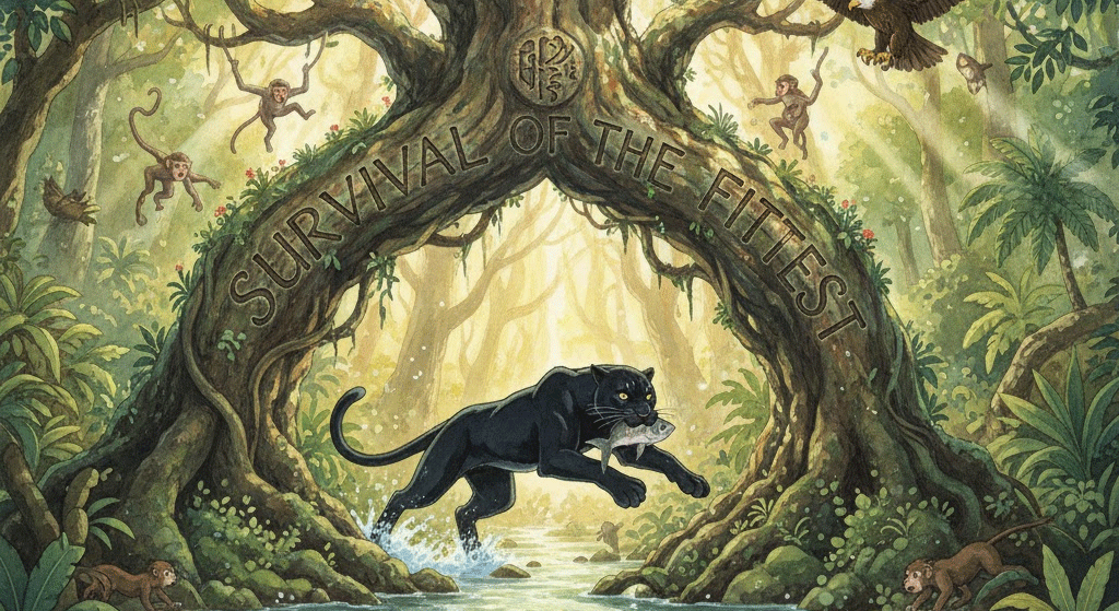 - survival of the fittest는 자연 선택(natural selection) 의 핵심 원리입니다. 지문은 강한 자가 살아남는 것이 아니라, 변화하는 환경에 가장 잘 적응(adaptation) 하는 개체가 살아남아 유전자를 남긴다는 생물학적 사실을 설명합니다.