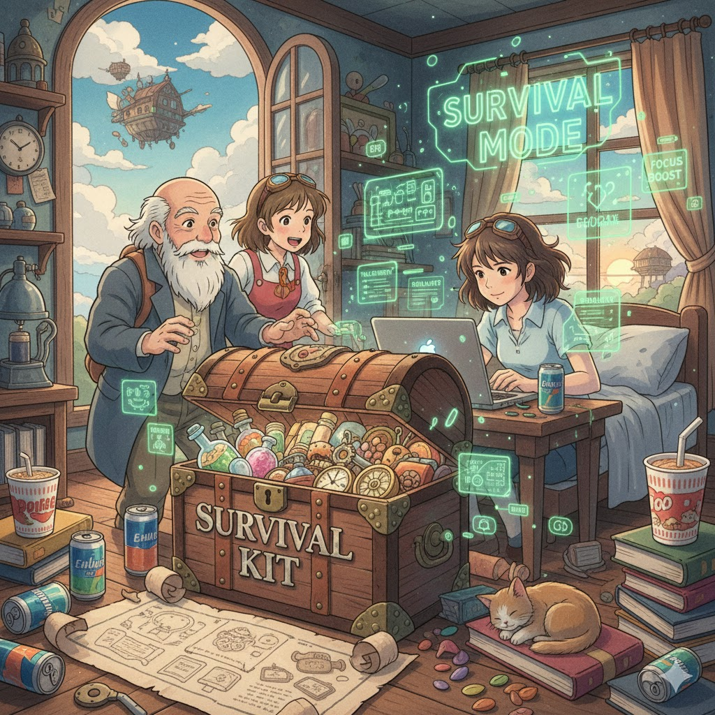 | kit/mode | 키트/모드 | 명사로, '도구' '와' '상태'. | '생존' '을' '위한' '물품' '세트' '나' '비상' '시' '집중' '하는' '심리적' '상태' '를' '나타냄'. |