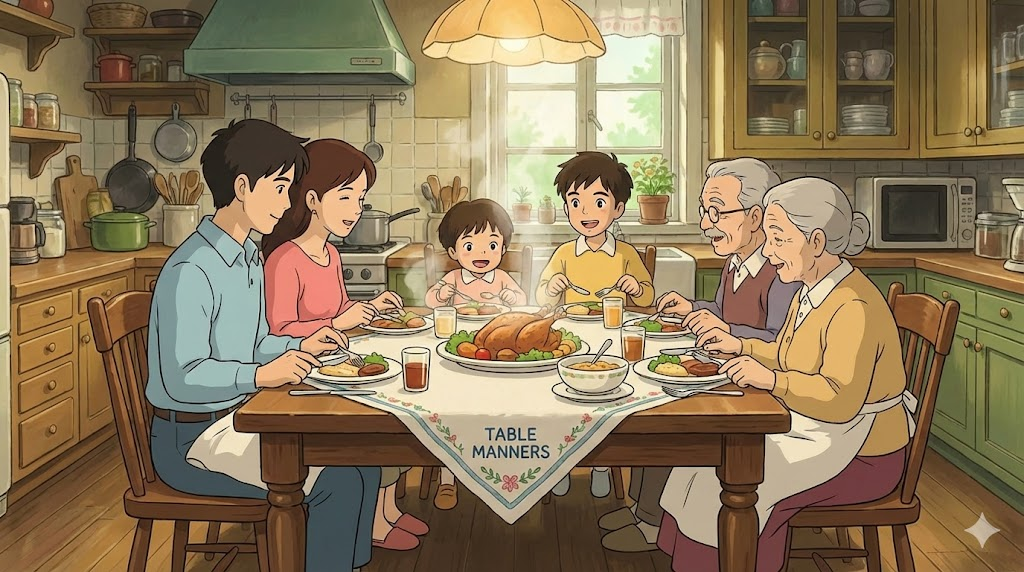 - Good table manners are important in social settings. (좋은 식사 예절은 사교적인 자리에서 중요하다.)