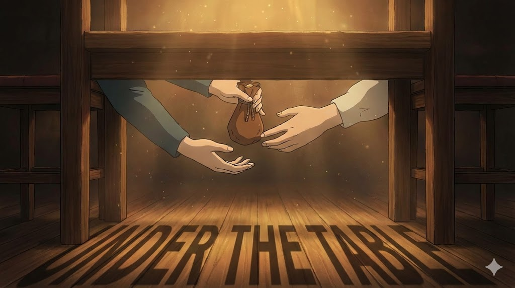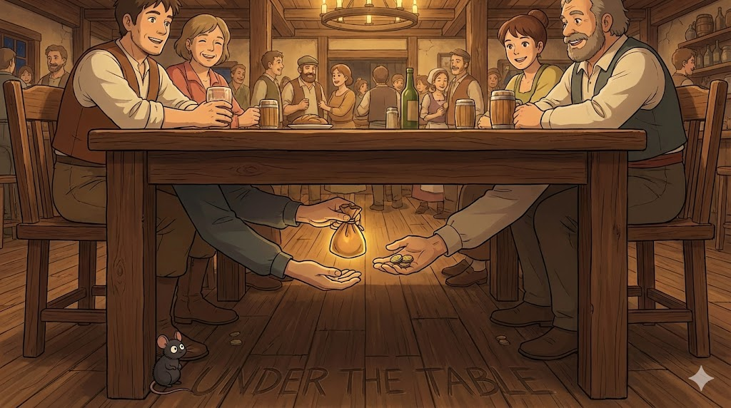 - 해석: 세금을 회피하거나 법을 어기며 몰래 돈을 주고받는 행위 (탁자 밑으로 거래하듯).