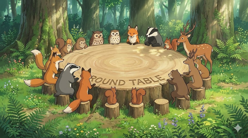 참석자들이 상석이나 말석의 구분 없이 둥근 탁자에 둘러앉아 대등한 자격으로 자유롭게 의견을 나누는 회의나 토론을 의미합니다. 아서 왕의 전설에서 유래했습니다.