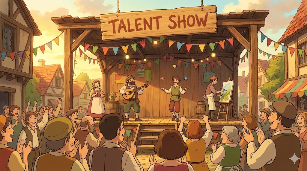노래, 춤, 연기, 코미디 등 참가자들이 자신의 재능을 대중이나 심사위원 앞에서 뽐내며 경쟁하는 오락 프로그램을 의미합니다. 학교 축제나 TV 오디션 프로그램 등이 이에 해당합니다.