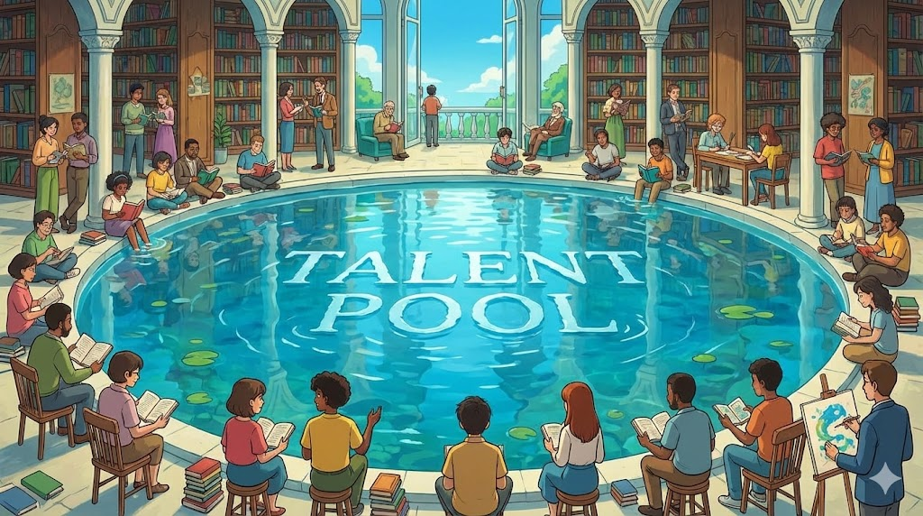 - The company has a large talent pool to choose from. (그 회사는 선택할 수 있는 큰 인재 풀을 가지고 있다.)