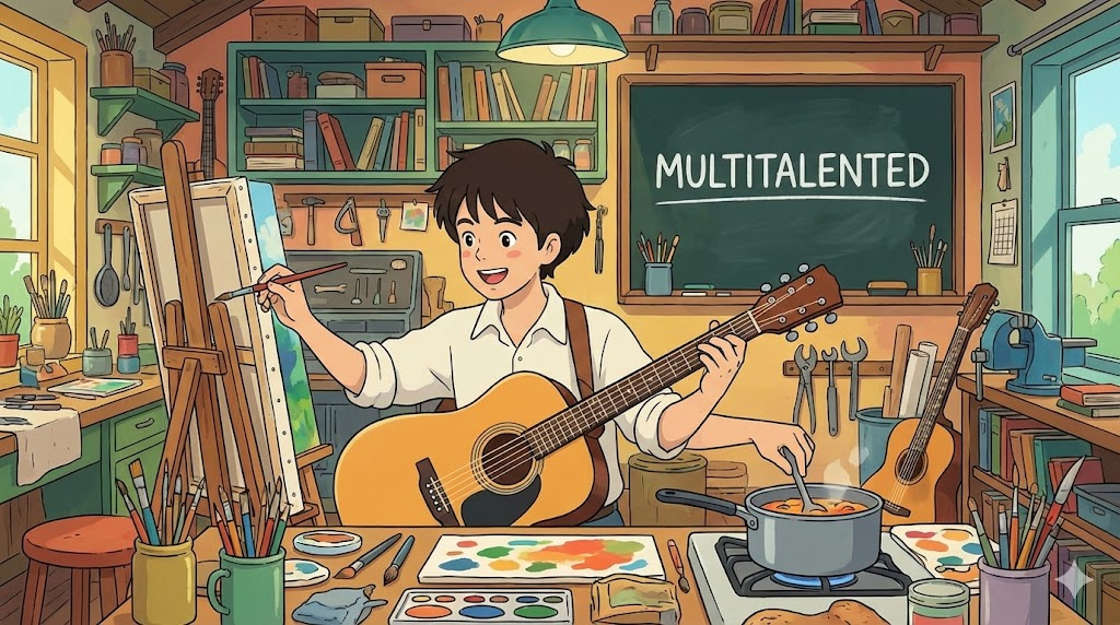 - 해석: 여러 분야에서 다양한 재능을 가지고 있는.
