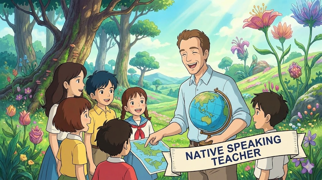 가르치는 언어(주로 영어)를 모국어로 사용하는 교사를 의미합니다. 정확한 발음과 자연스러운 표현을 배우기 위해 선호됩니다.