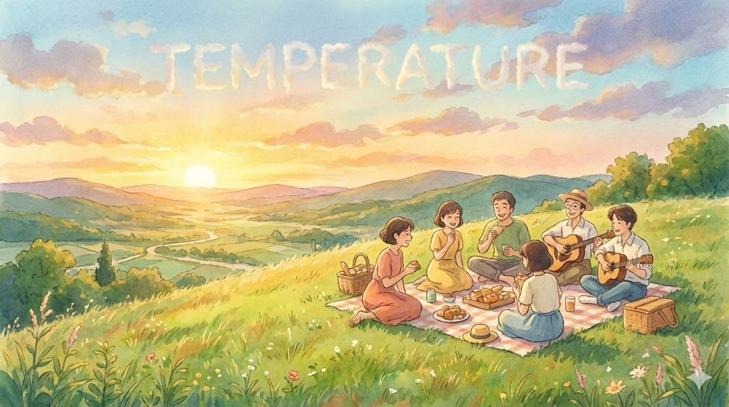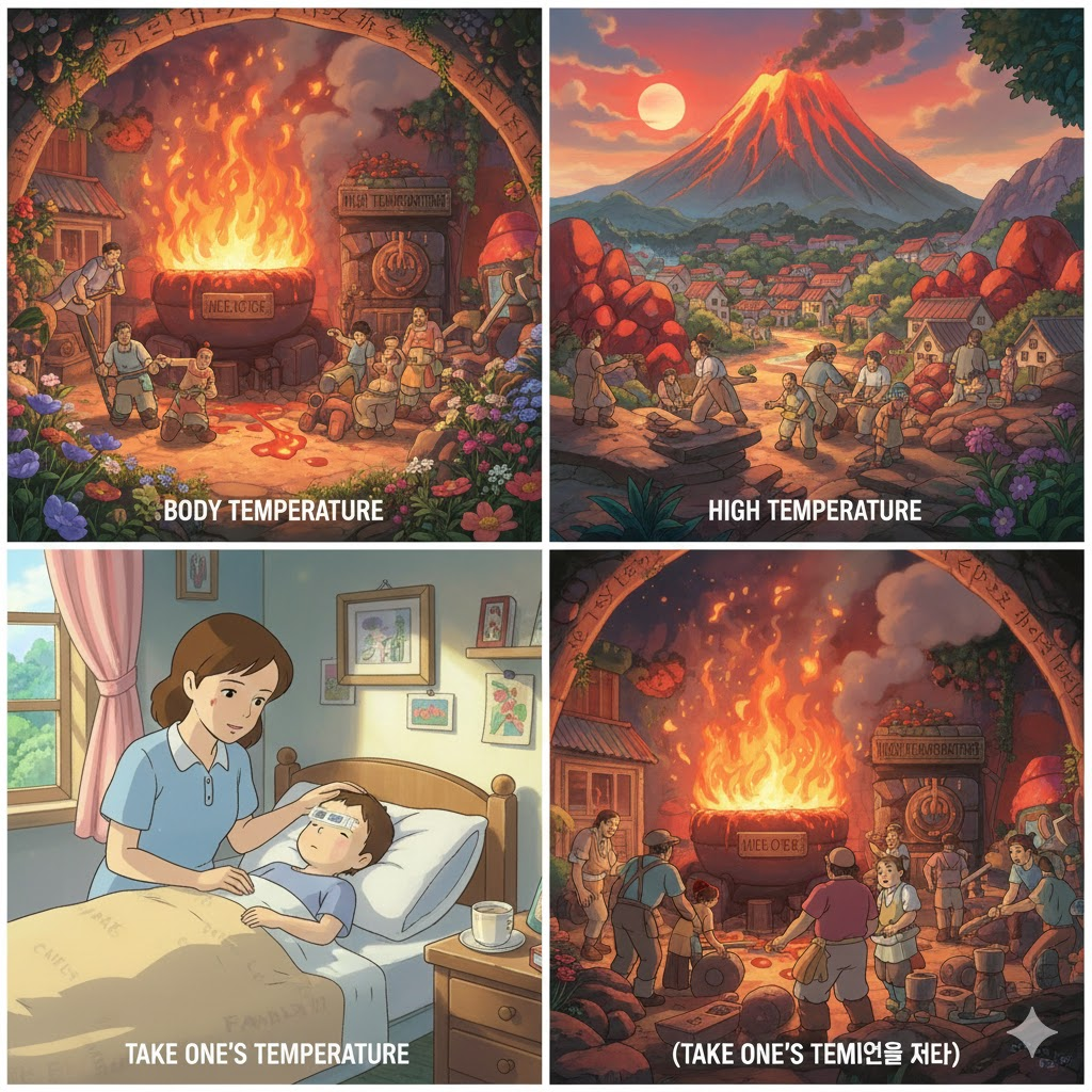 | 명사 (N.) | 온도, 기온 | 대기나 물체의 뜨겁고 차가운 정도를 나타내는 수치. | The temperature dropped below freezing. (기온이 영하로 떨어졌다.) |