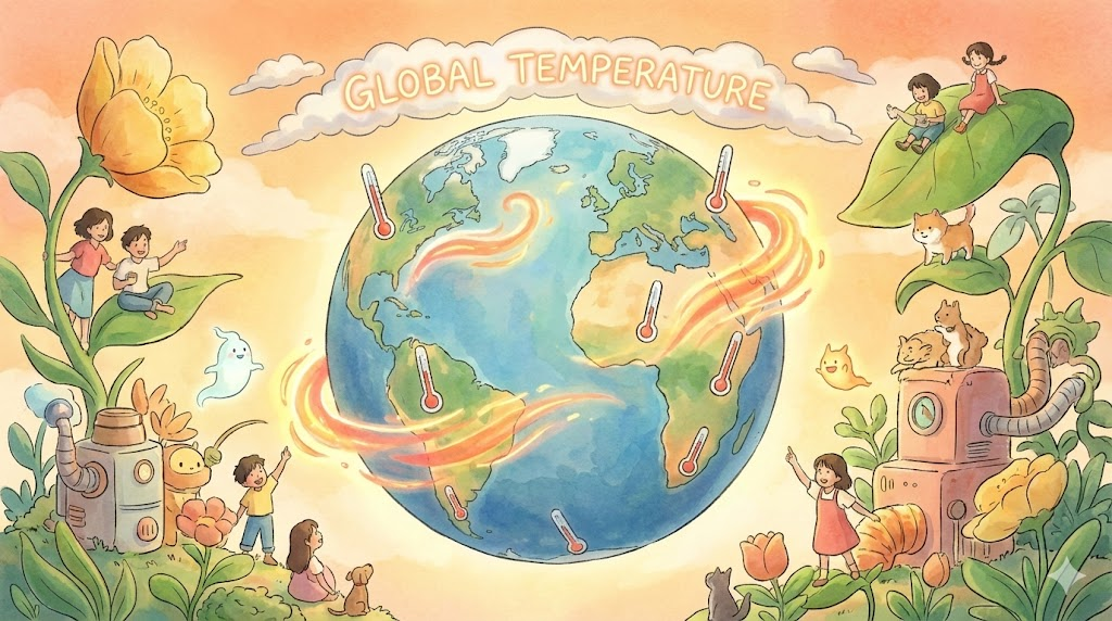 지구 전체 대기의 평균적인 온도를 의미합니다. 주로 기후 변화(climate change)나 지구 온난화(global warming)와 관련하여, 환경 문제의 심각성을 나타내는 지표로 사용됩니다.1