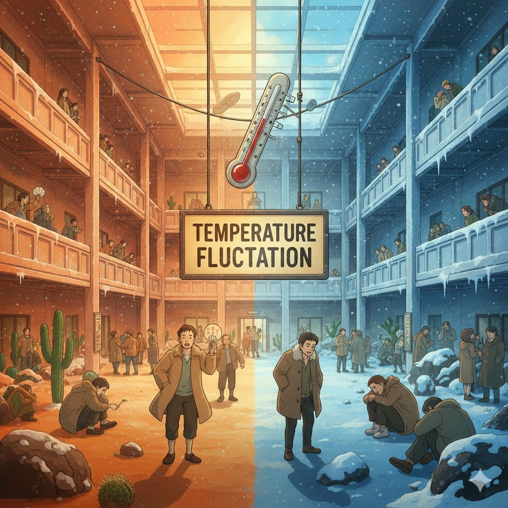 - 해석: 온도가 오르내리며 일정하지 않고 변동하는 현상.