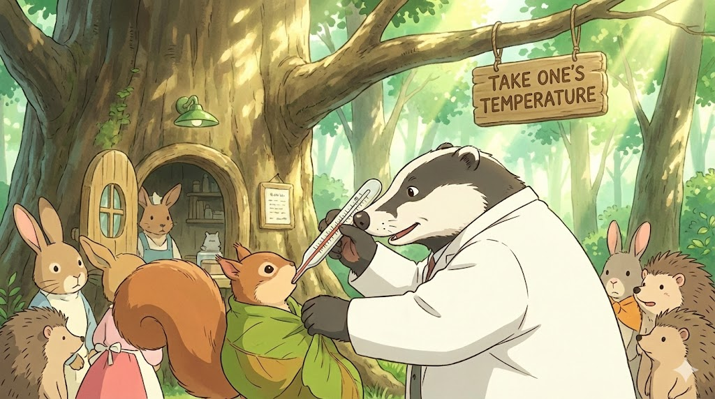 - 해석: 체온계를 사용하여 열이 있는지 확인하는 행위.