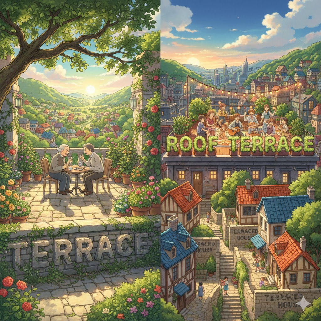 테라스, 주거 형태. 건물에 딸린 휴식 공간이나 벽을 공유하는 주택 양식.