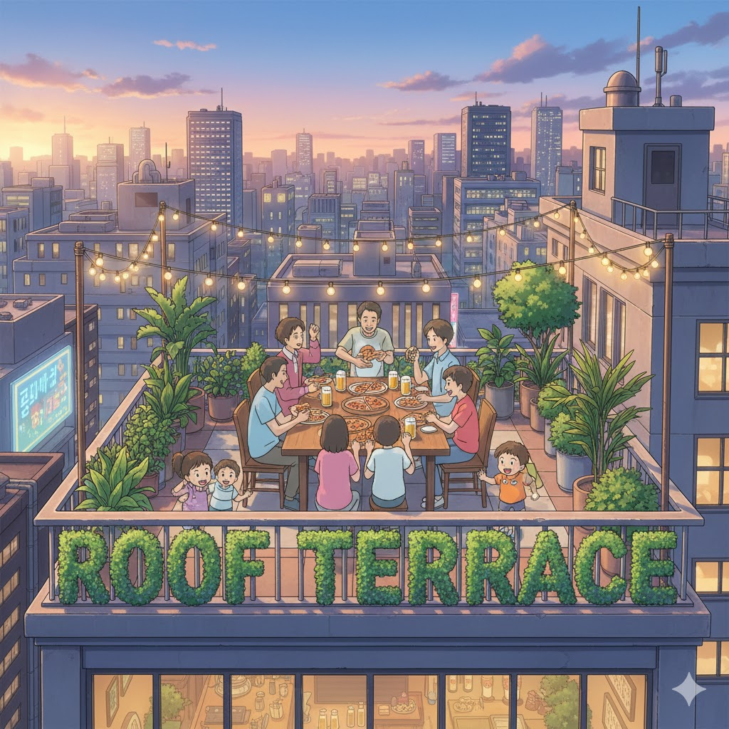 - 해석: 건물 지붕 위에 평평하게 만들어진 휴식이나 정원 공간.