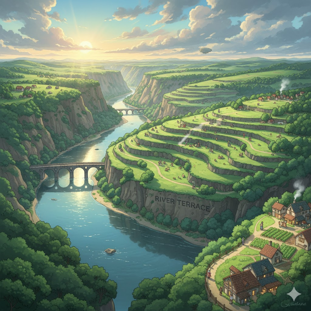 강의 흐름에 의해 침식과 퇴적 작용이 반복되면서 강 주변에 형성된 계단 모양의 지형을 의미합니다. 과거에 강바닥이었던 곳이 융기하거나 수면이 낮아져서 생겨난 평평한 땅입니다.