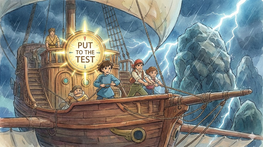 - 예문: The crisis really put the new government to the test. (그 위기는 새 정부를 정말로 시험에 들게 했다.)