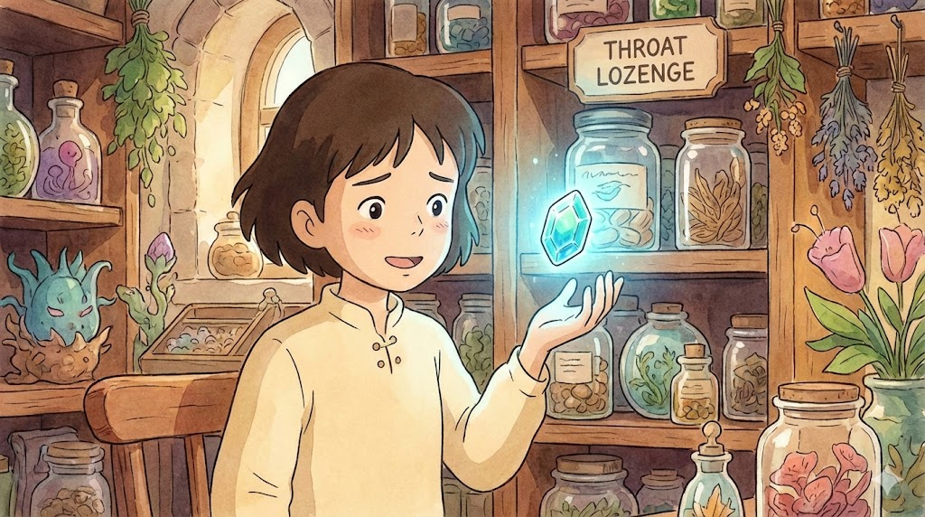 - 해석: 목의 통증을 완화하기 위해 입안에서 녹여 먹는 약용 사탕.
