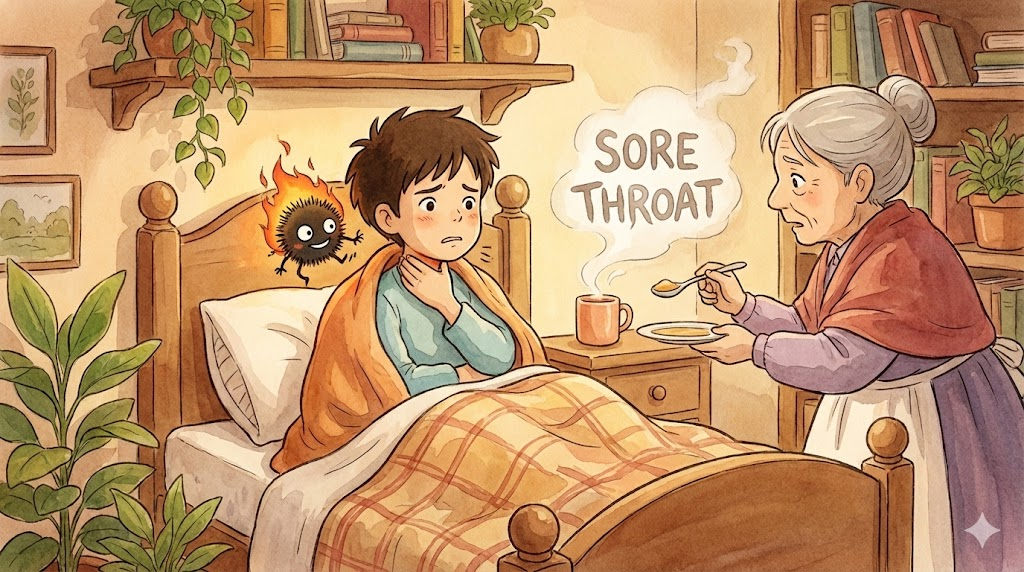 - 해석: 감기나 바이러스 등으로 인해 목이 붓고 아픈 증상.