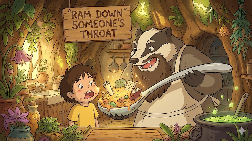 | ram down | 억지로 밀어넣다 | 숙어구로, '강요'. | '음식' '을' '억지로' '목구멍' '에' '밀어' '넣듯' '생각' '을' '강제적' '으로' '주입' '함을' '의미함'. |