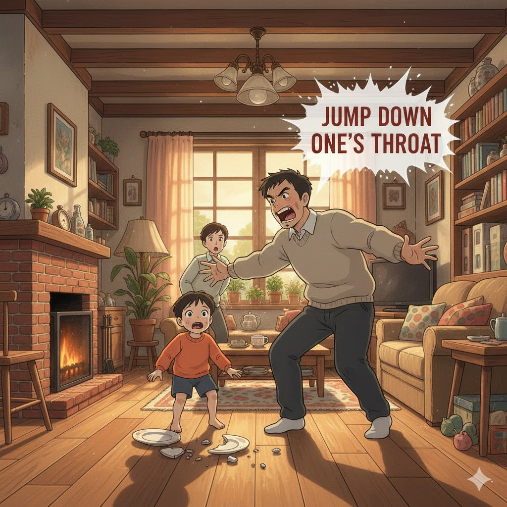 - 예문: I only asked a simple question; there was no need to jump down my throat. (나는 단지 간단한 질문을 했을 뿐이다. 나에게 화내며 쏘아붙일 필요는 없었다.)