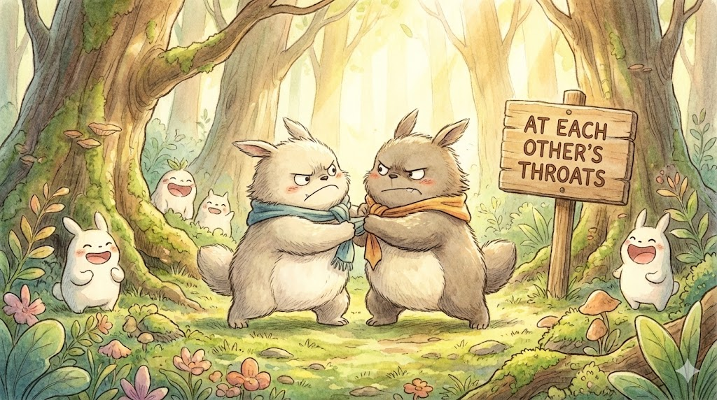 - 예문: The two political parties have been at each other's throats over the budget issue. (두 정당은 예산 문제를 두고 서로 심하게 다투고 있다.)