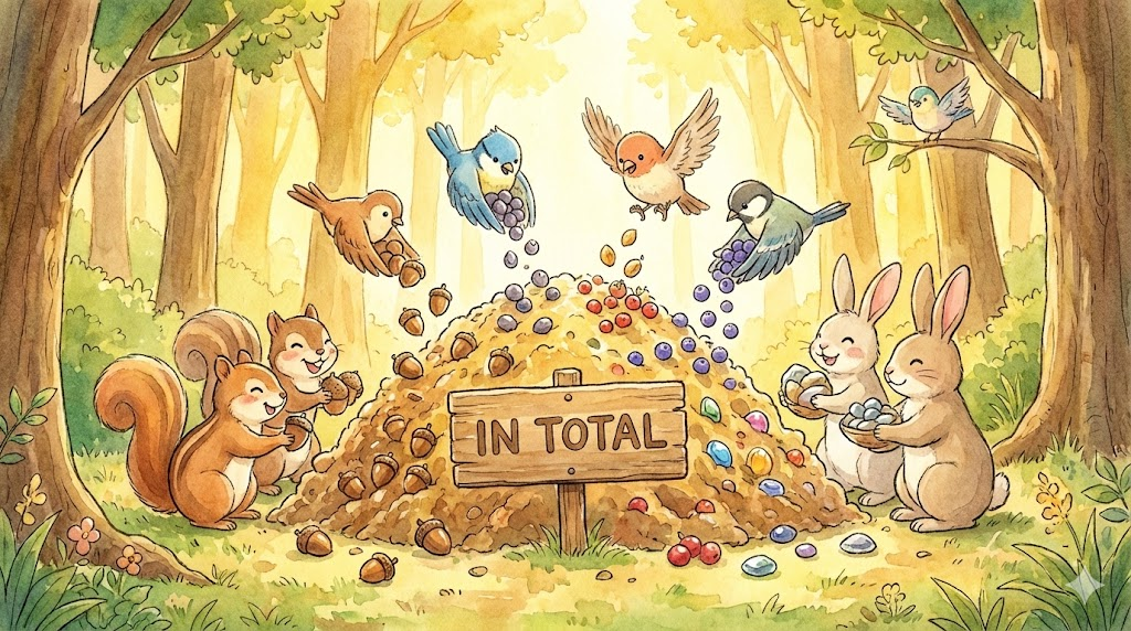 | in total | 총, 합쳐서 | 부사구로, '종합적' '수량'. | '여러' '항목' '을' '모두' '더했을' '때' '의' '결과' '임을' '나타냄'. |