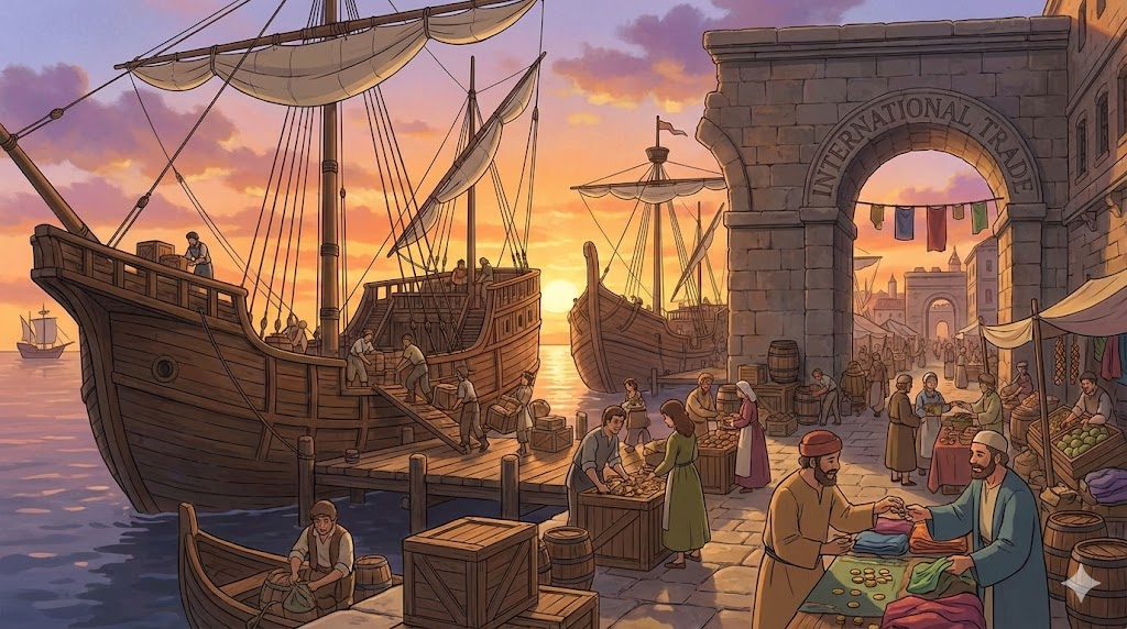 무역, 거래. 상품이나 서비스의 교환, 경제 정책, 그리고 무역의 공정성 및 장벽.