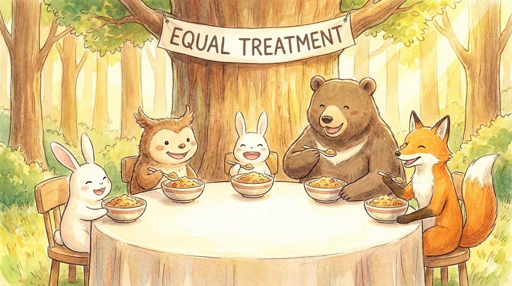 - 해석: 차별 없이 모든 사람이나 대상에게 동일한 원칙과 방식으로 대우하는 것.