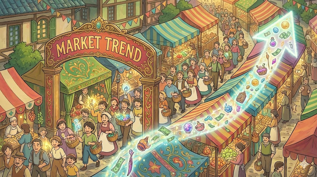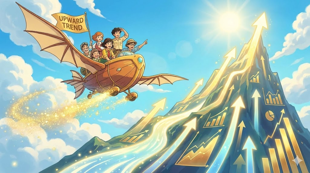 - 해석: 수치, 가격, 또는 성과가 점차적으로 증가하는 방향. (downward trend와 대비)