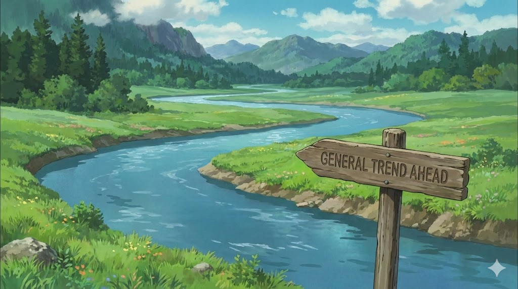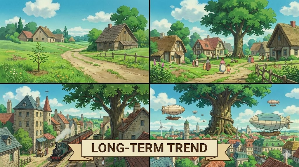 - 해석: 단기간의 변동이 아닌, 오랜 시간 동안 지속되는 근본적인 방향이나 경향. (short-term trend와 대비)