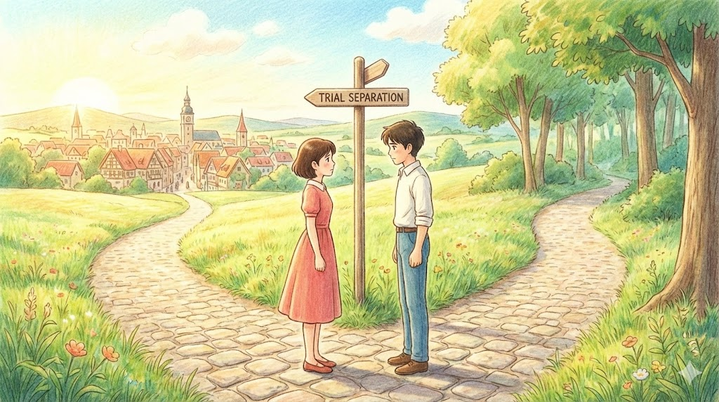 부부가 이혼을 결정하기 전에 일정 기간 동안 떨어져 살면서 관계를 재고하고 화해할 가능성을 모색하는 일시적인 별거 상태를 의미합니다. 관계를 회복하거나 다음 단계(이혼)를 결정하기 위한 시도입니다.