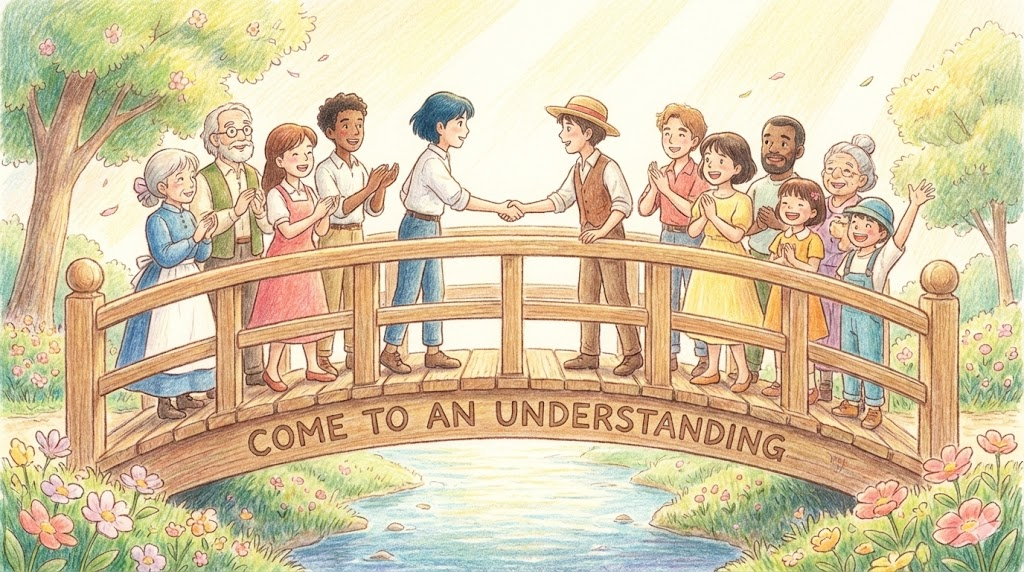 - 예문: The two companies finally came to an understanding regarding the terms of the merger. (두 회사는 마침내 합병 조건에 관한 합의에 이르렀다.)