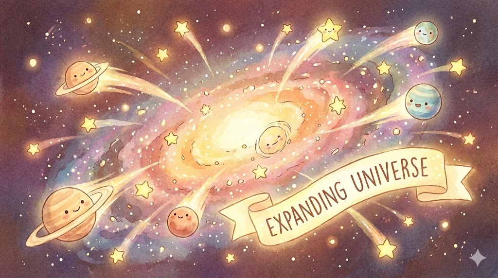 - 해석: 우주 공간이 시간이 지남에 따라 점점 커지고 있다는 우주론적 관측 사실.
