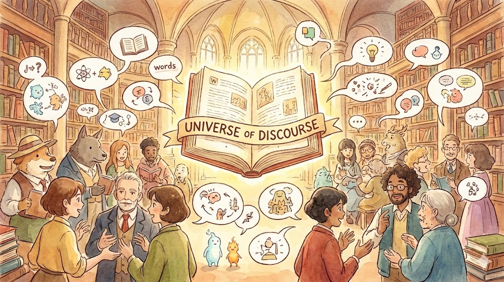 - 예문: Before debating, participants must agree on the universe of discourse to avoid miscommunication. (토론 전에 참가자들은 오해를 피하기 위해 논의의 영역에 합의해야 한다.)