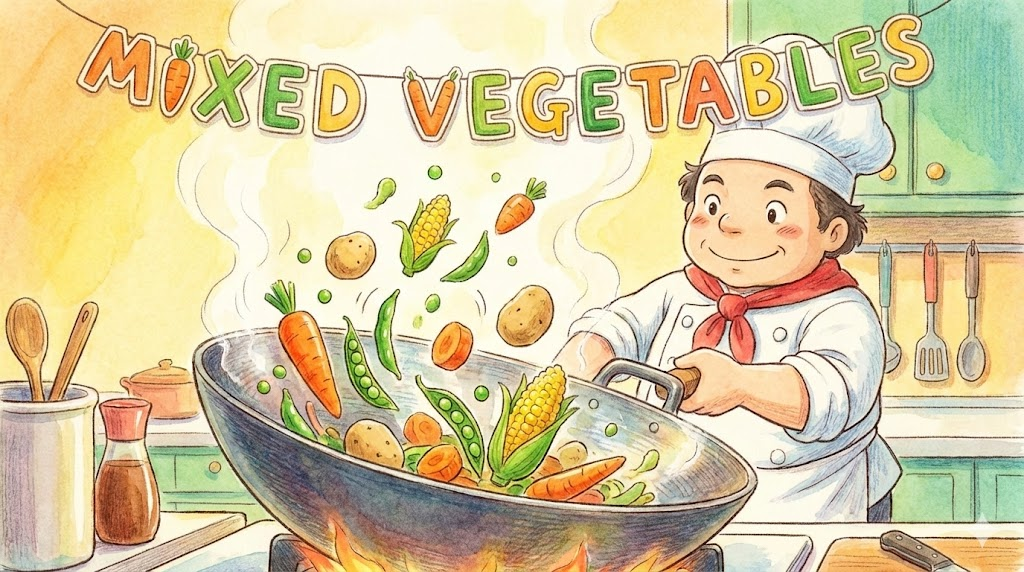 편의를 위해 두 가지 이상의 다양한 채소(당근, 완두콩, 옥수수 등)를 섞어서 포장해 놓은 상품을 의미합니다. 주로 냉동 식품 형태로 판매됩니다.