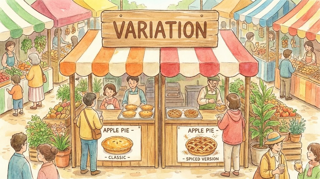 어떤 제품, 이야기, 혹은 개념이 원본이나 표준 형태와 구별되는 별개의 형태나 설명을 가지고 있음을 의미합니다. 다양성, 수정, 또는 의견 차이를 나타낼 때 사용합니다.