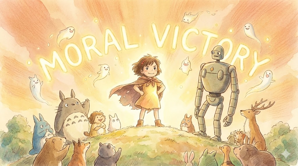 - 해석: 실제 결과에서는 패배했지만, 윤리적, 도의적 측면이나 경기력에서 높은 평가를 받아 얻는 승리감. (결과적 승리와 대비)