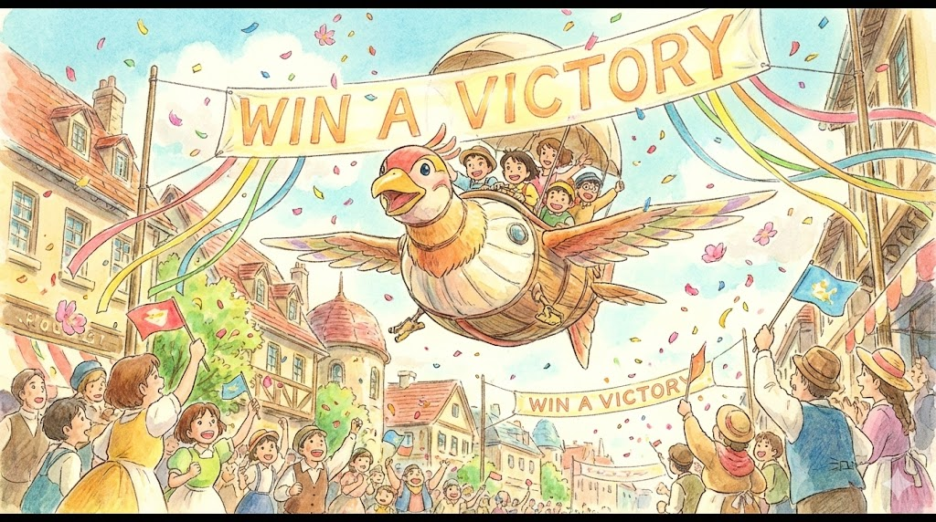 승리, 성공. 경쟁이나 어려움에서 상대를 이기거나 목표를 달성한 결과.