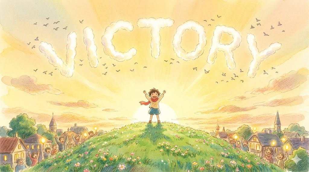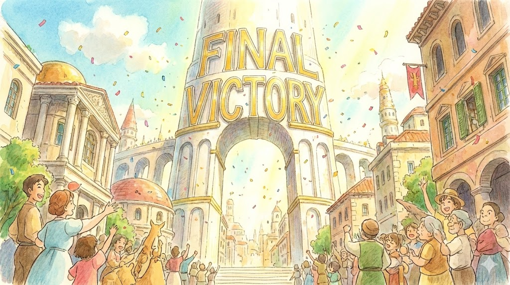 - 해석: 일련의 경쟁, 전쟁, 또는 노력에서 얻는 궁극적이고 마지막 승리.